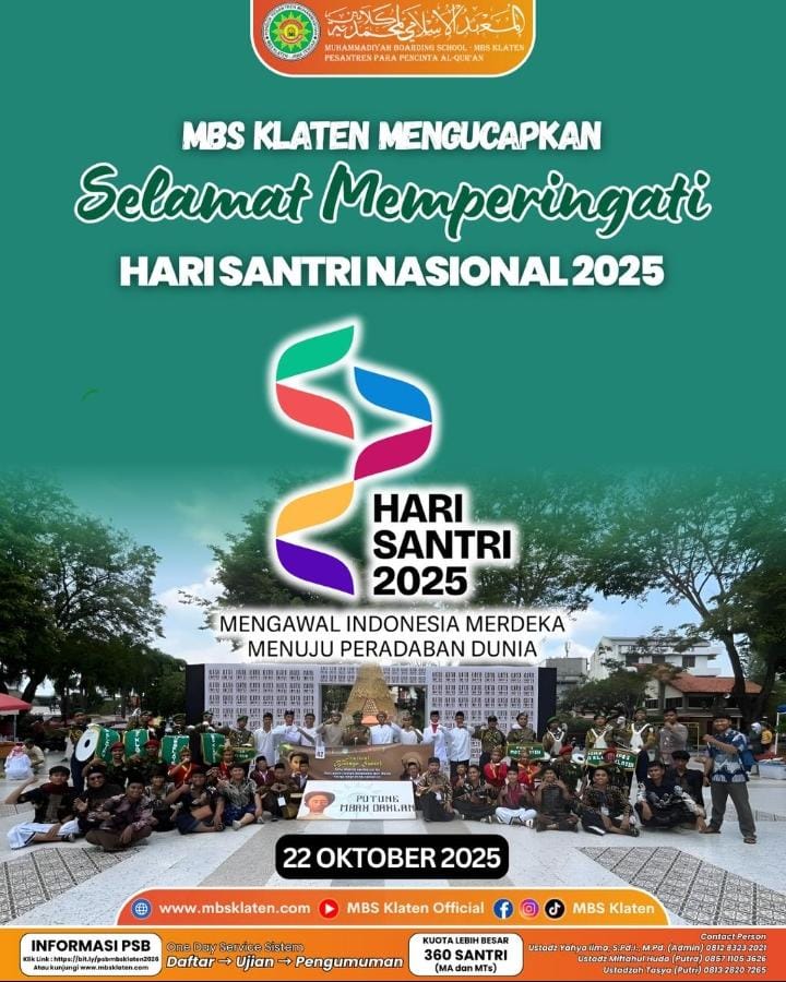 “Peringatan Hari Santri tahun ini memiliki makna khusus karena menandai satu dekade peringatan sejak pertama kali ditetapkan pemerintah pada tahun 2015. Hari Santri harus menjadi momentum kebangkitan santri Indonesia. Santri tidak hanya menguasai kitab kuning, tetapi juga harus menguasai teknologi, sains dan bahasa dunia. Dunia digital harus menjadi ladang dakwah baru bagi para santri,” jelas Bupati Klaten.