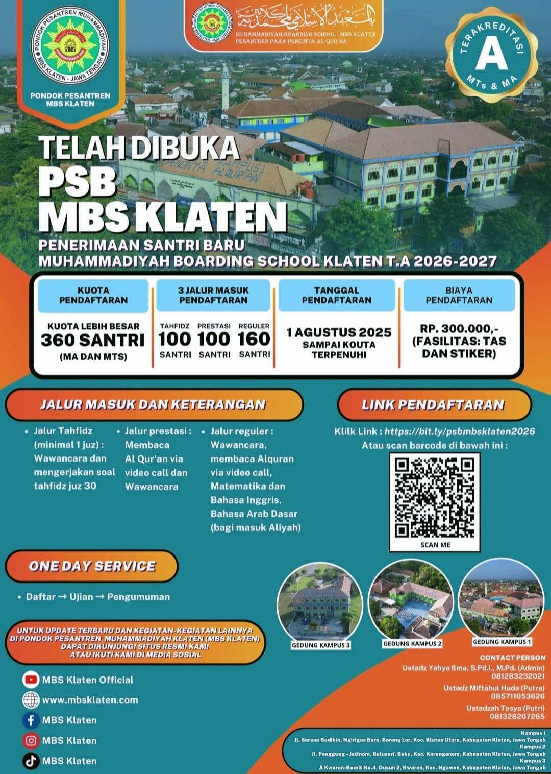 Hal tersebut disampaikanĀ KH Marpuji AliĀ uasi meresmikan ruang perpustakaan dan Laboratorium computer di kampus 2 Pondok Pesantren Muhammadiyah, Muhammadiyah Boarding school (MBS) Klaten, Desa Beku, Kecamatan Karanganom, Ahad (21/9/2025). Peresmian bersamaan dengan pengajian tri wulan yang dihadiri seluruh civitas MBS Klaten, wali santri dan lainnya.
